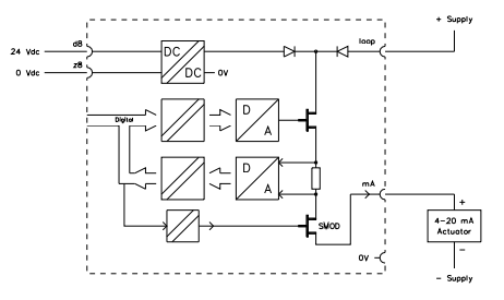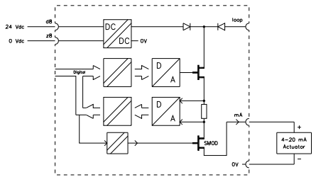 O módulo de saída analógica segura SAO-0220m possui dois canais de saída de 0(4) a 20 mA para aplicações de controle analógico. A carga pode ser apenas resistiva ou capacitiva. Cargas indutivas farão com que o módulo de saída analógica seja reportado como defeituoso. As duas saídas analógicas são isoladas galvanicamente das tensões de 24 Vcc e 5 Vcc. Os pinos 0 V 1 (d14) e 0 V 2 (d20) estão interconectados no módulo. Cada canal de saída analógica consiste em um conversor D/A de 12 bits para o valor de saída e um conversor A/D que lê o valor de saída. Utilizando o conversor A/D, é possível verificar o funcionamento correto do canal de saída. Dentro do Intervalo de Teste de Diagnóstico configurado, as saídas analógicas são testadas para: